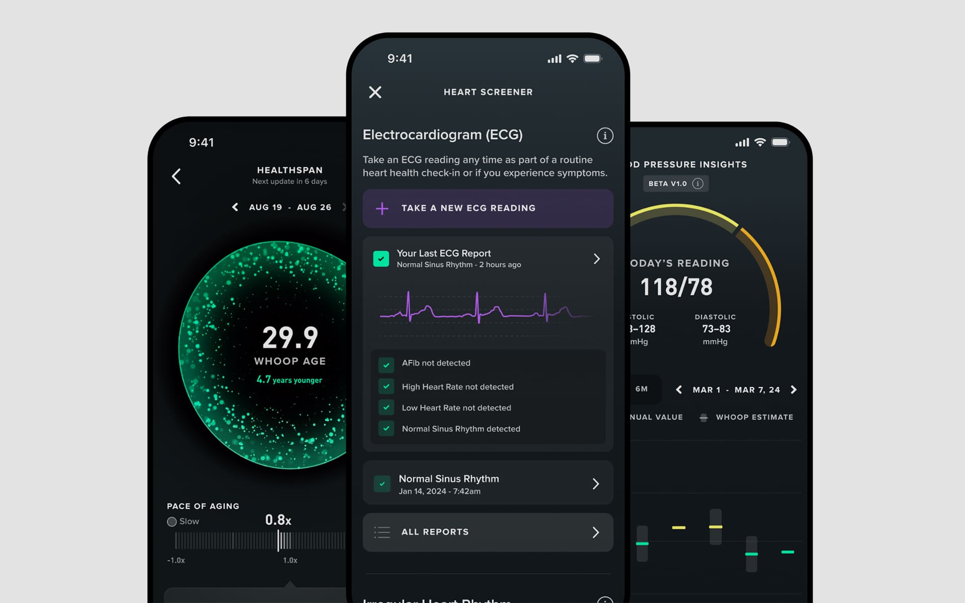 - ✅ Датчик ЭКГ медицинского класса с функцией определения нерегулярного сердечного ритма при фибрилляции предсердий (WHOOP MG, подписка Life)